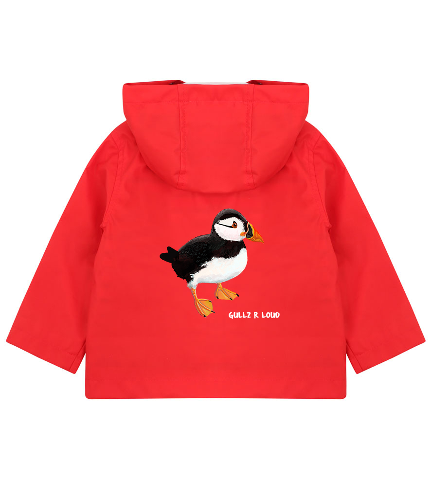 Featuring our large Prince the Puffin design on the back, and a smaller version on one of the front pockets, our baby/toddler’s puffin raincoats in red make for fabulous fun for the mini puddle jumpers in your life.   Available in sizes 0-6 months up to 3-4 yrs.
