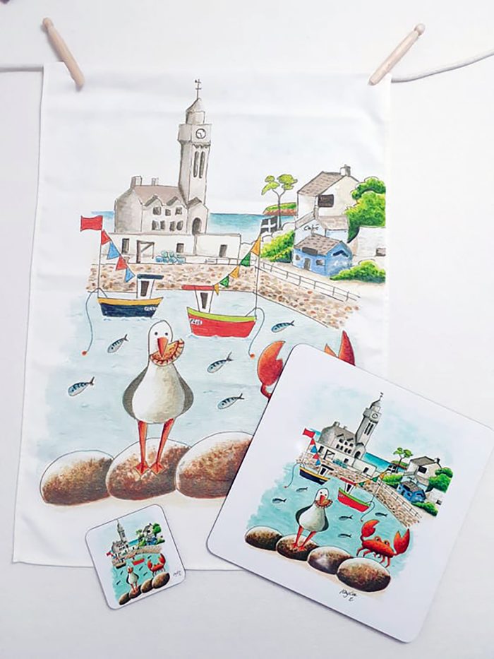 Porthleven Pasty Thief Placemat is printed from an original acrylic painting by KayCee of Gullz R Loud™. The painting features the infamous Cornish Pasty Thieving Gull and his crabby friend sitting by the harbourside. With the Ship Inn and the Fishermans’ Mission in the background; this placemat would make a wonderful gift for lovers of Cornwall (and for many an amusing reminder of what happened to their pasty!!)