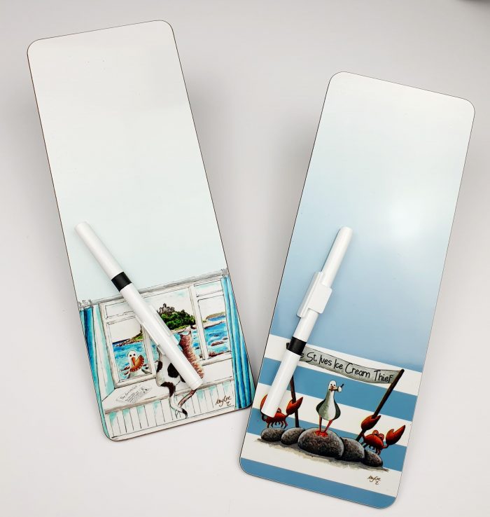 Our Note Board has a gloss finish and is printed from an original acrylic painting by KayCee of Gullz R Loud™. The painting features the infamous St Ives Ice Cream Thieving Gull on a Cornish Blue and White Striped Background and is a part of our Coastal Stripes Collection of kitchen and homewares.