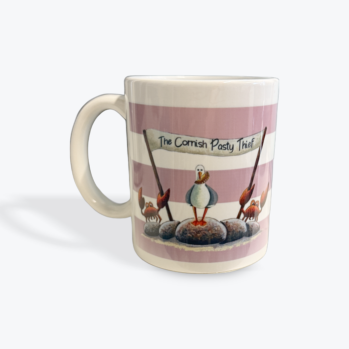 Our Stripe Gull Thief Mug is hand printed by us at our HQ in Gulval, Cornwall. With the wording ‘St Ives’ or ‘Cornwall’ on one side and either our pasty thief gull or ice cream thief gull image on the other, it would make a wonderful gift for any lovers of St. Ives or Cornwall and for many an amusing reminder of what happened to their pasty/ice cream!!! Mix and match these mugs; four designs and seven stripe colourways to choose from/